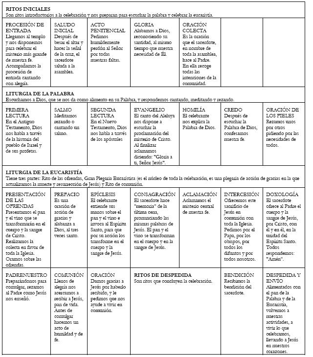 -DESPEDIDA Y ENVÍO: Alimentados con el pan de la Palabra y de la Eucaristía, volvemos a nuestras actividades, el sacerdote nos despide con palabras como "la misa ha terminado, podemos ir en paz". -Respondemos: "Demos gracias a Dios".